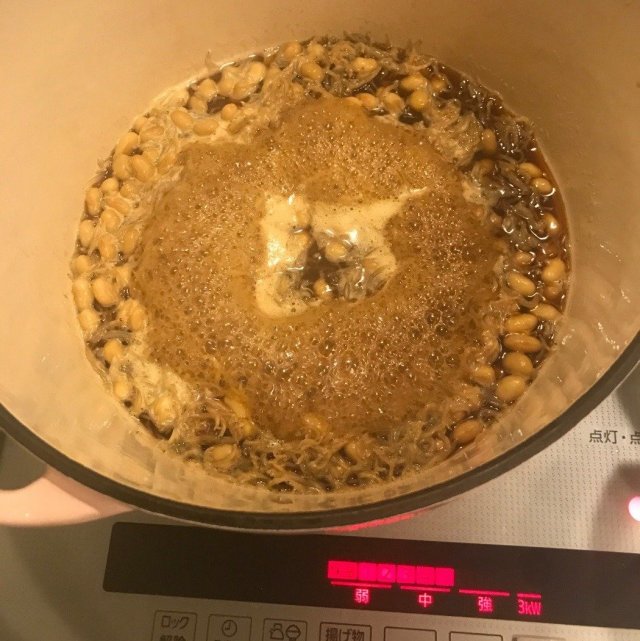 次は大豆・じゃこをいれてフタをかぶせ蒸気が出るまで煮ます。
